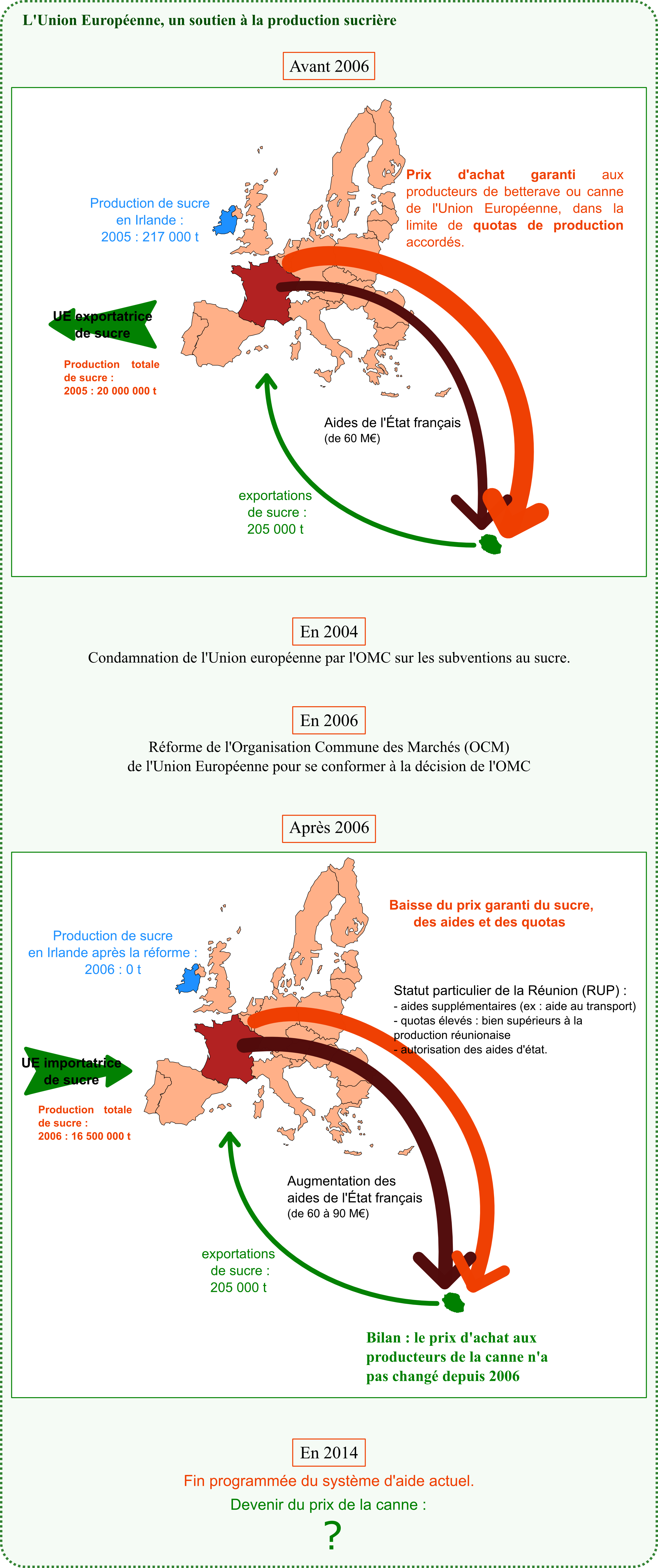 La Réunion n’a pas été trop touchée par la réforme sucrière de 2006. En effet, alors que les quotas accordés et le prix du sucre ont diminué dans toute l’Union Européenne, la Réunion n’en a pas souffert. Du fait de son statut de territoire ultra-marin, elle bénéficie d’un statut particulier qui lui permet de recevoir des aides supplémentaires de l’Europe et de l’État français. Ainsi, la baisse du prix européen de la canne est compensée par une hausse des aides de l’État ; le prix n’a donc pas été modifié depuis 2006. En revanche, dans tout le reste de l’Europe, le tonnage de sucre a baissé et des industries ont dû fermer. Par exemple, l’Irlande, qui produisait avant la réforme autant de sucre que la Réunion, a dû abandonner ce secteur d’activité après 2006.